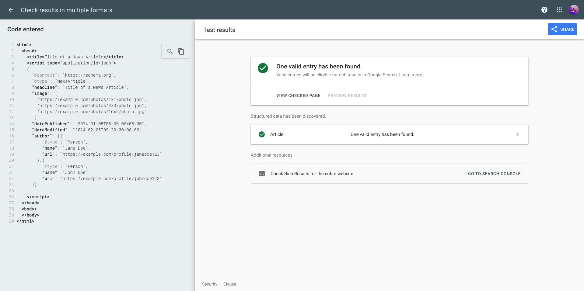 Post pages are where JSON-LD has the most visible impact. A proper Article schema can get your post displayed with a thumbnail and date directly on Google Search: